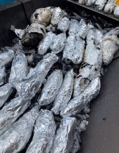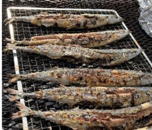 日本の秋の味覚・サンマや焼き芋を炭火で焼いて