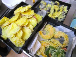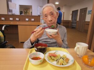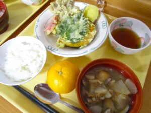 昼食のメニューは「天ぷら(さつまいも、かぼちゃ、なす、大葉、舞茸、カニカマ)、大根汁、みかんです✨