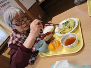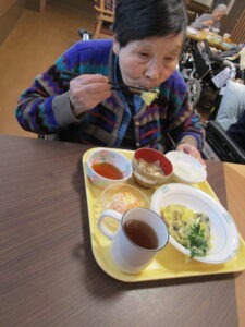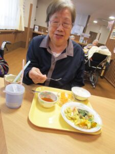 食材をご利用者様に切っていただき、ボリューム満点のお食事が完成🙌