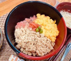 卵、鶏そぼろ、桜でんぶの三色丼は見た目も