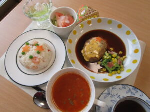 エビピラフ、ハンバーグデミグラスソース、押し麦入りミネストローネなど