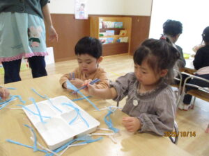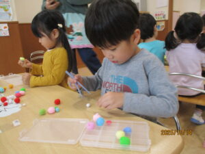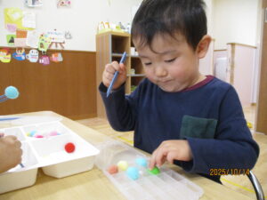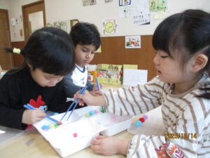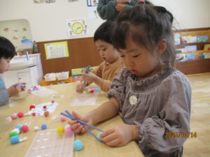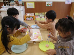 その後、スポンジや紐等を使用して箸の練習をしました。