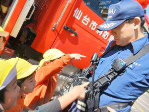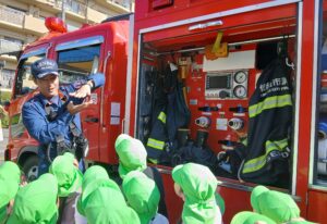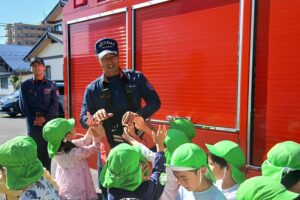 「どうしたら消防士さんになれますか?」消防車を見ながら「これは何をするものですか?」