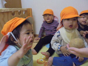 栄養士の話しを聞きながら、『おおきくなあれ🎵』とお願いする子ども達😊