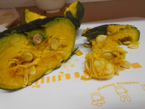 かぼちゃの中ってどうなってるの❓と子ども達に見せたり、