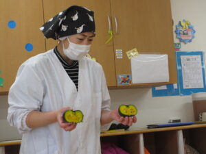 かぼちゃの中ってどうなってるの❓と子ども達に見せたり、