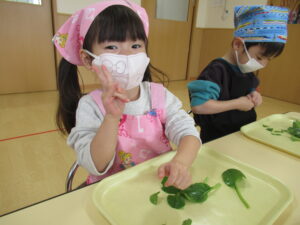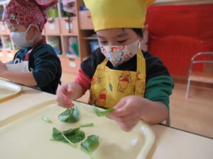 前日みんなで収穫した小松菜を丁寧に細かくちぎります🙌