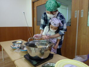 贈呈されたくじら組はさっそくクッキングにとりかかりました。