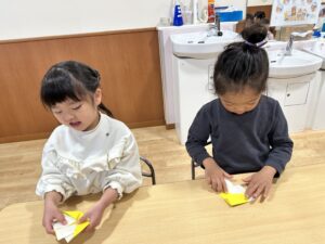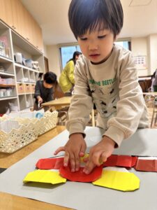 実はくじら組がクッキングしている間に、きのこの折り紙を折ったり貼ったり、