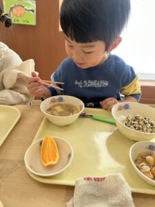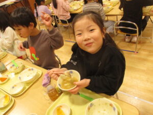 「おいし~い!」「これ、まんぼう組さんのしめじ?」など、にこにこ笑顔できのこ汁を頬張っていました♪