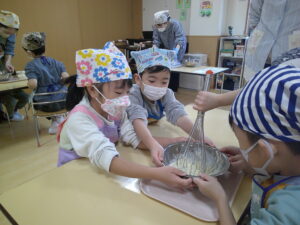 生地の材料を協力して混ぜるところから始まります💫