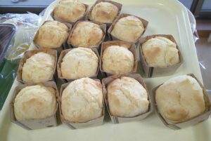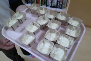 出来上がった生地を型に入れ、給食室で焼いてもらい、お菓子の家の土台にします🏠