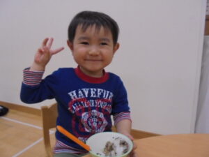 保育園の手作りふりかけをかけて、完成すると
