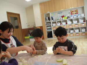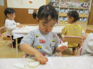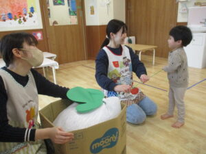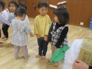 1歳児クラスぺんぎん組では、かぶと仲良くなろうをテーマに行いました。