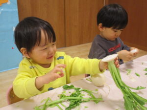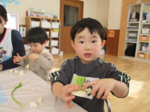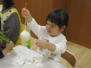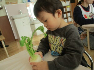 2歳児クラスらっこ組では、かぶと大根のちがいを知ろうをテーマに行いました。