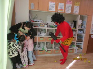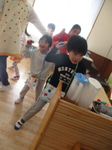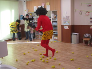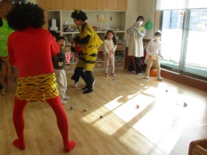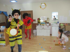 先生の近くや柱の陰に隠れたり、勇敢に立ち向かい手作りの豆を投げたり、