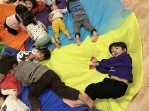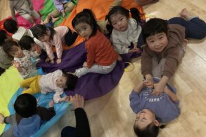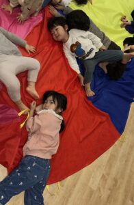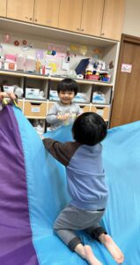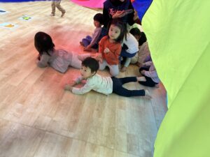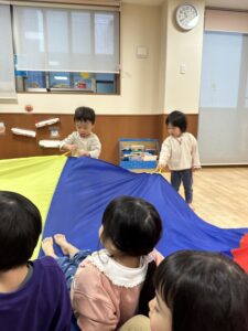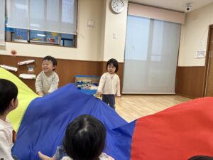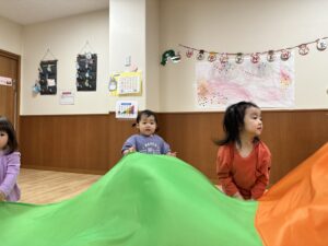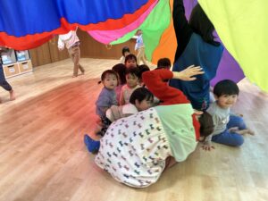 大きい子に憧れ、パラバルーンで一緒に遊んでいる
