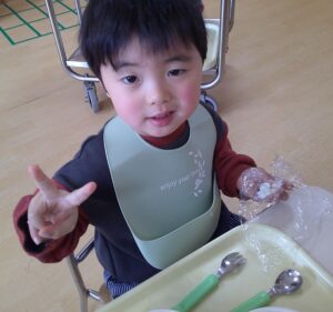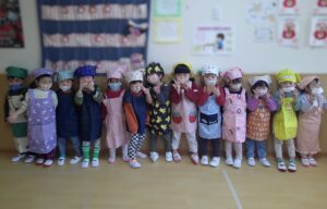 エプロン姿がとてもかわいく、先生たちの目尻が下がります😊