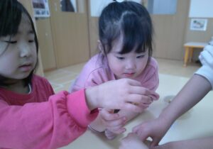 固さや匂いの違いを探しながら、「カリカリしてる」「〇〇くんのほっぺみたい」など